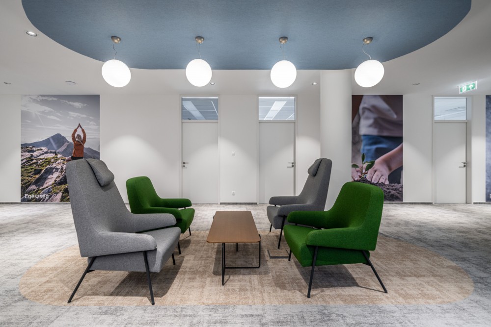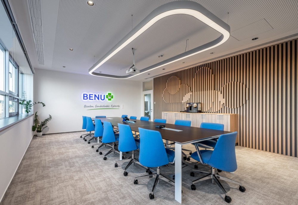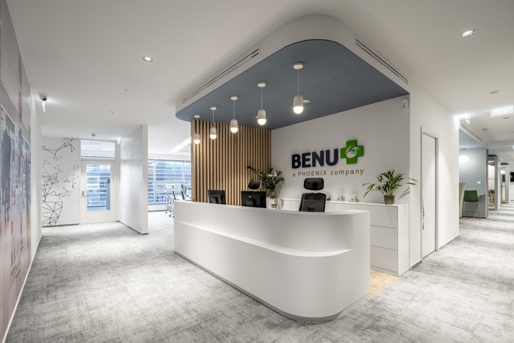 Harmonikus, világos, pozitív és modern tér alakult ki, ahol a hőmérséklet zónánként szabályozható, és amit a BENU Gyógyszertárak színvilága, a pasztell kék és pasztell zöld határoz meg.