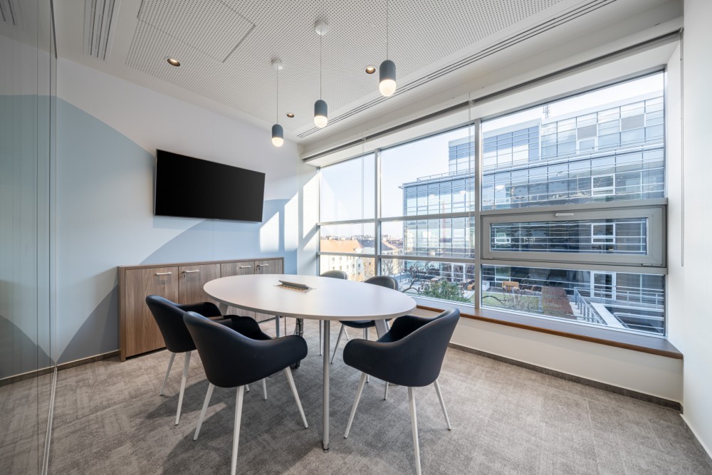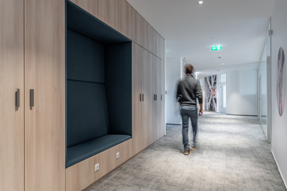 Az előző irodához képest, ahol a kisebb, pár személyes irodahelyiségek voltak többségben, nagyrészt felváltották a nyitott irodaterek, amelyek mellett megmaradtak a vezetői irodák. A nyitott tereknél törekedtünk arra, hogy tagoltan alakítsuk ki azokat, biztosítva a megfelelő munkakörnyezetet az eltérő munkát végző részlegeknek. De nagyon odafigyeltünk az akusztikára is: olyan hangelnyelő paneleket építettek be a falakba, amelyek hatására a lehető legkevésbé zavarjuk egymást.
