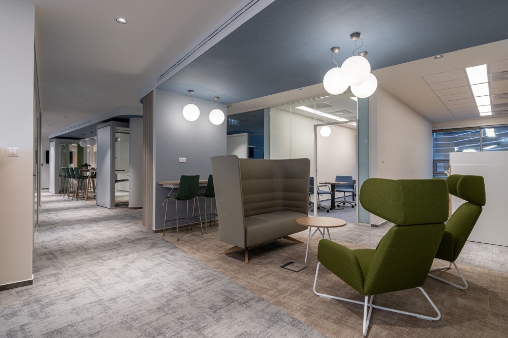 A nyitott irodák mellett különböző kollaborációs területek kialakítására is volt lehetőség.